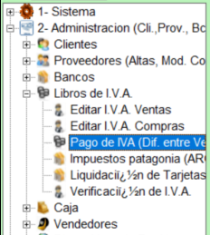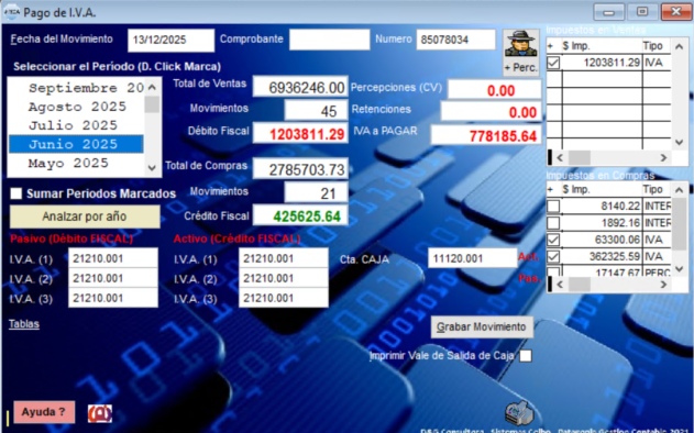 Señalar el periodo deseado, se obtiene los totales de Venta final, la cantidad de comprobantes y el total del DEBITO fiscal; y los totales de Compra final, la cantidad de comprobantes y el total del CREDITO fiscal. Ademas muestra la diferencia entre el credito fiscal y el debito fiscal, mostrando el real IVA a pagar, o el IVA a favor; y los totales de los impuestos de las ventas y de las compras en dos tablas. Todo ello se puede imprimir picando en el icono de la impresora. Tambien se puede generar un asiento si se paga ese IVA, picando en Grabar movimiento si la contabilidad estaria activada.